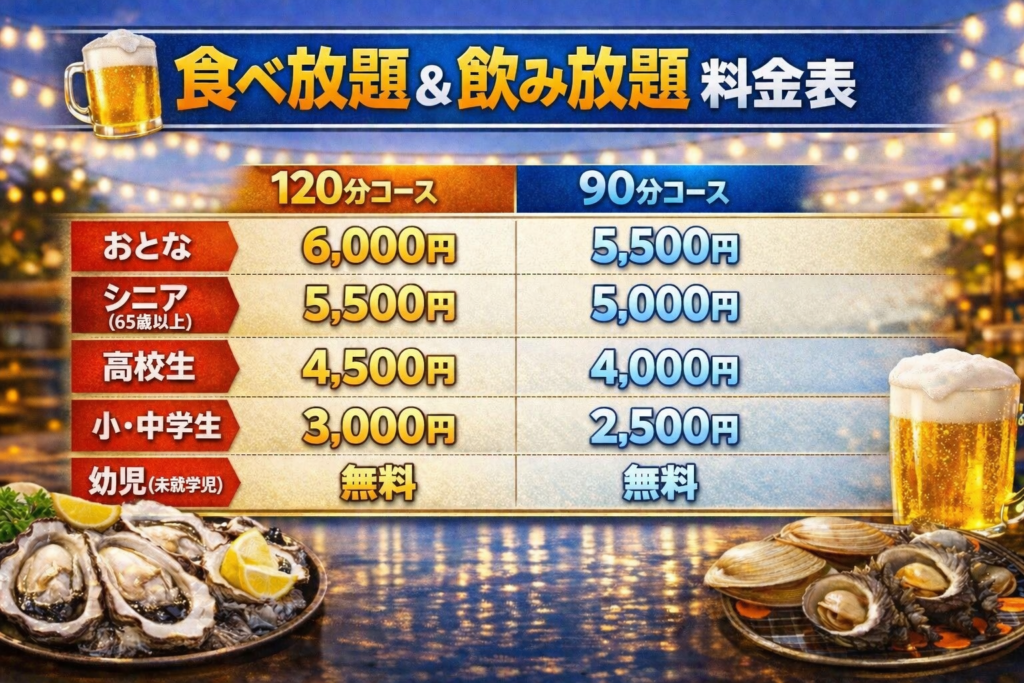 牡蠣・はまぐり・サザエ・季節のお魚など、水産会社直営だからこそ実現できる圧倒的な鮮度の海鮮が食べ放題!一口食べればわかる、ぷりぷり触感と濃厚な旨み。ここでしか味わえない美味しさです。